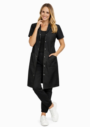 Ten fartuch ochronny o długości do kolan, z krótkim rękawem i eleganckim kołnierzem, zapinany jest na wytrzymałe, nierdzewne napy. Idealny zarówno do szpitala, kliniki, gabinetu kosmetycznego, jak i SPA.