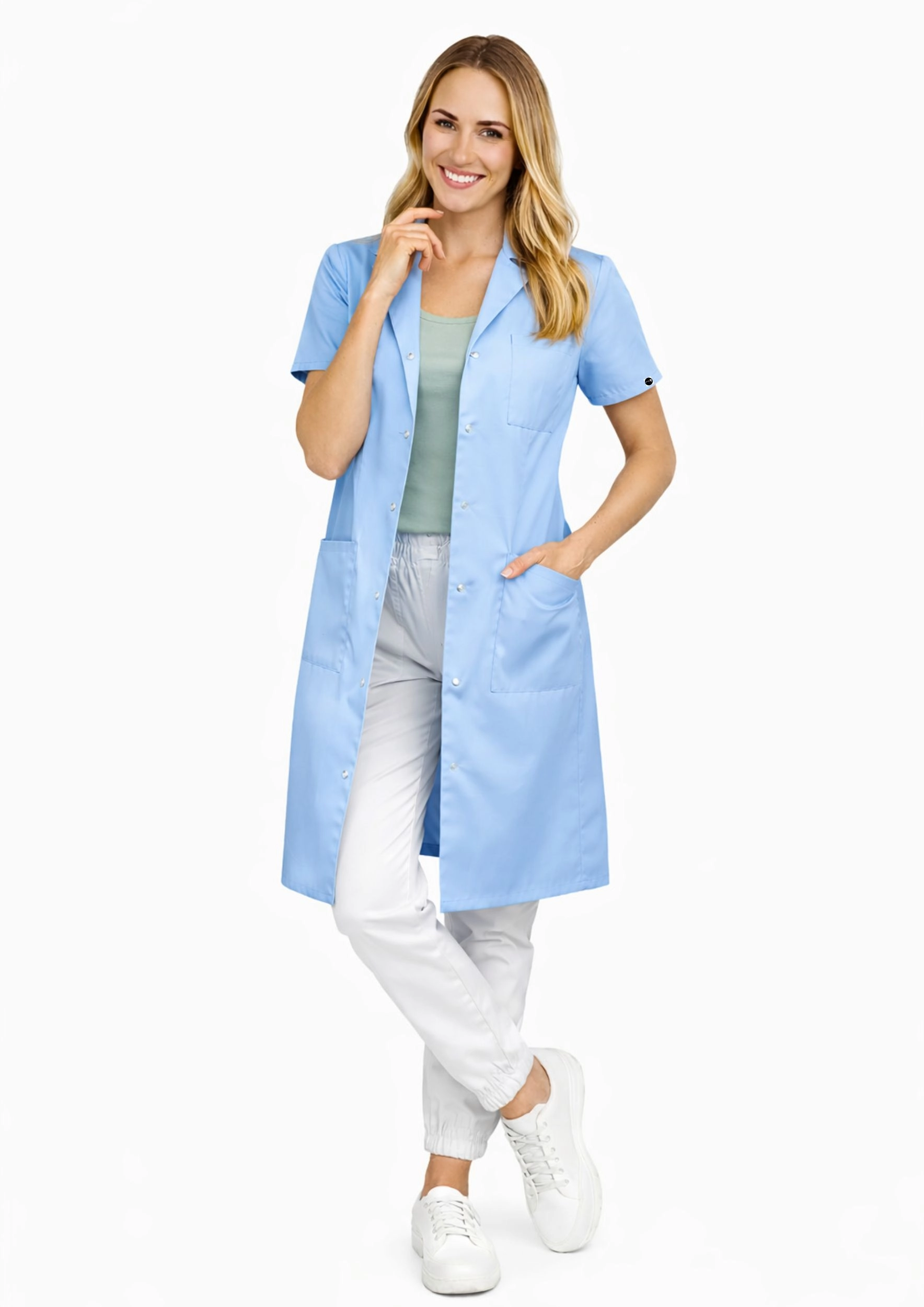 Ten fartuch ochronny o długości do kolan, z krótkim rękawem i eleganckim kołnierzem, zapinany jest na wytrzymałe, nierdzewne napy. Idealny zarówno do szpitala, kliniki, gabinetu kosmetycznego, jak i SPA.