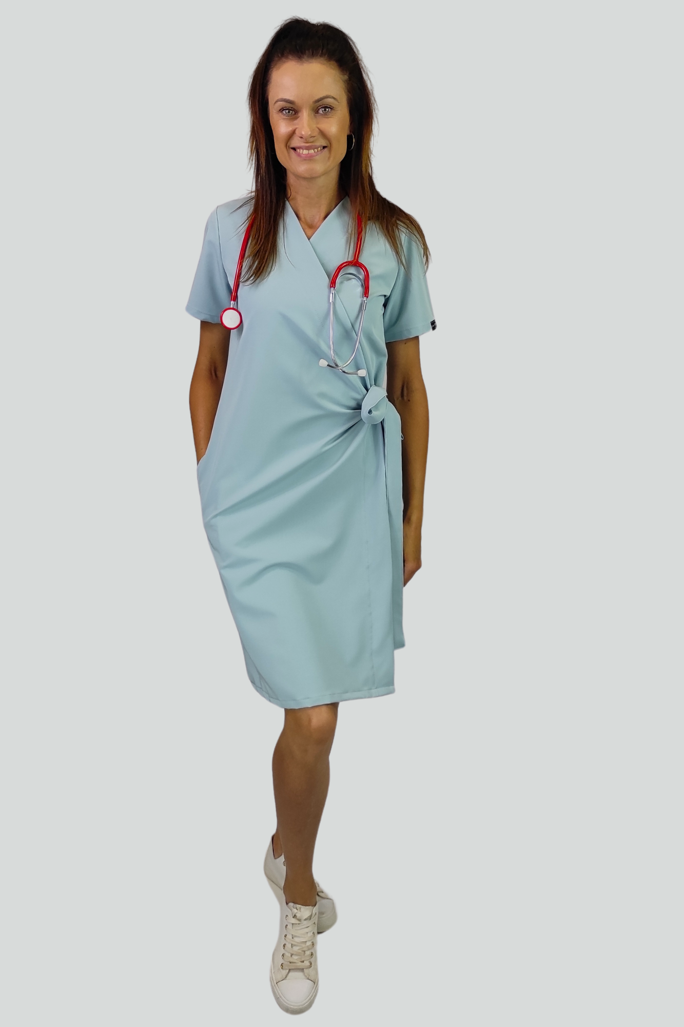 Poznaj sukienkę medyczną kimono w kroju kopertowym – nie jest to zwykły uniform, to stylowa odpowiedź na potrzeby nowoczesnych kobiet pracujących w branży medycznej i beauty.