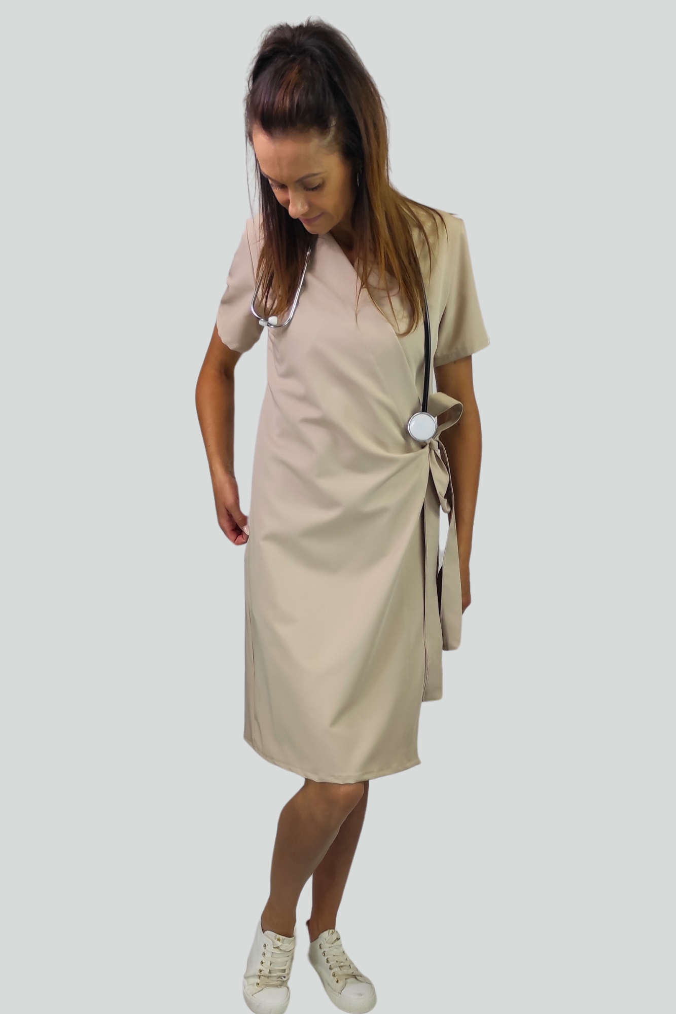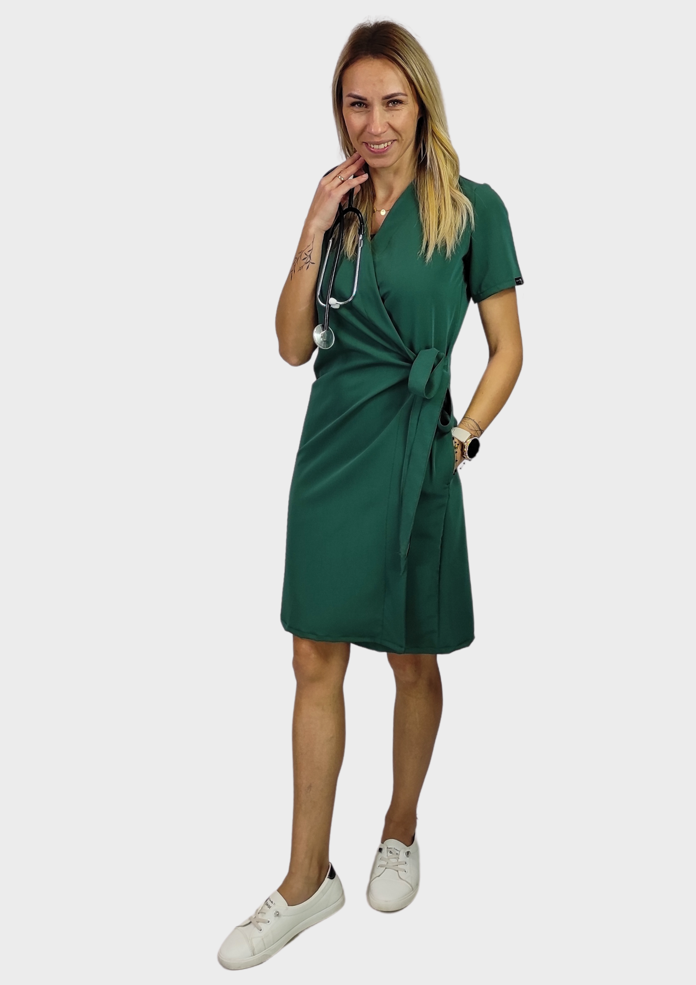 Poznaj sukienkę medyczną kimono w kroju kopertowym – nie jest to zwykły uniform, to stylowa odpowiedź na potrzeby nowoczesnych kobiet pracujących w branży medycznej i beauty.