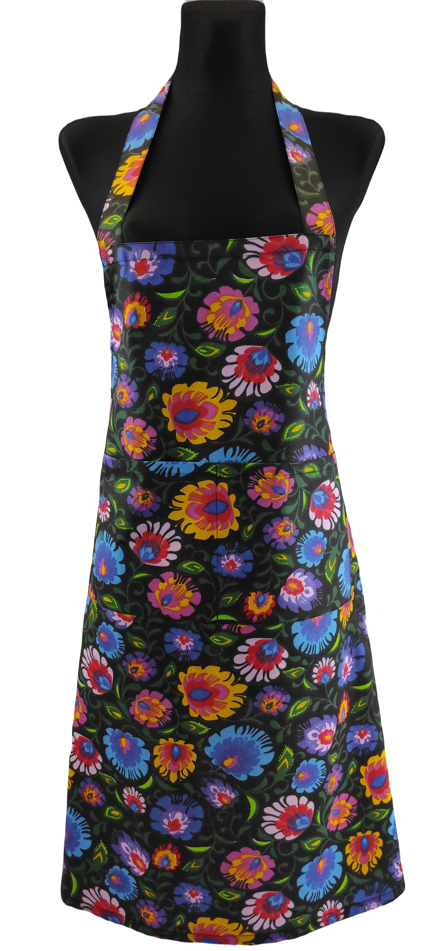Zapewniają skuteczną ochronę przed zabrudzeniem ubrania. Dzięki wiązaniu w pasie możliwe jest regulowanie rozmiaru. Pasek na szyi - bez możliwości regulowania przyszyty na stałe - doszyta duża kieszeń podzielona na pół