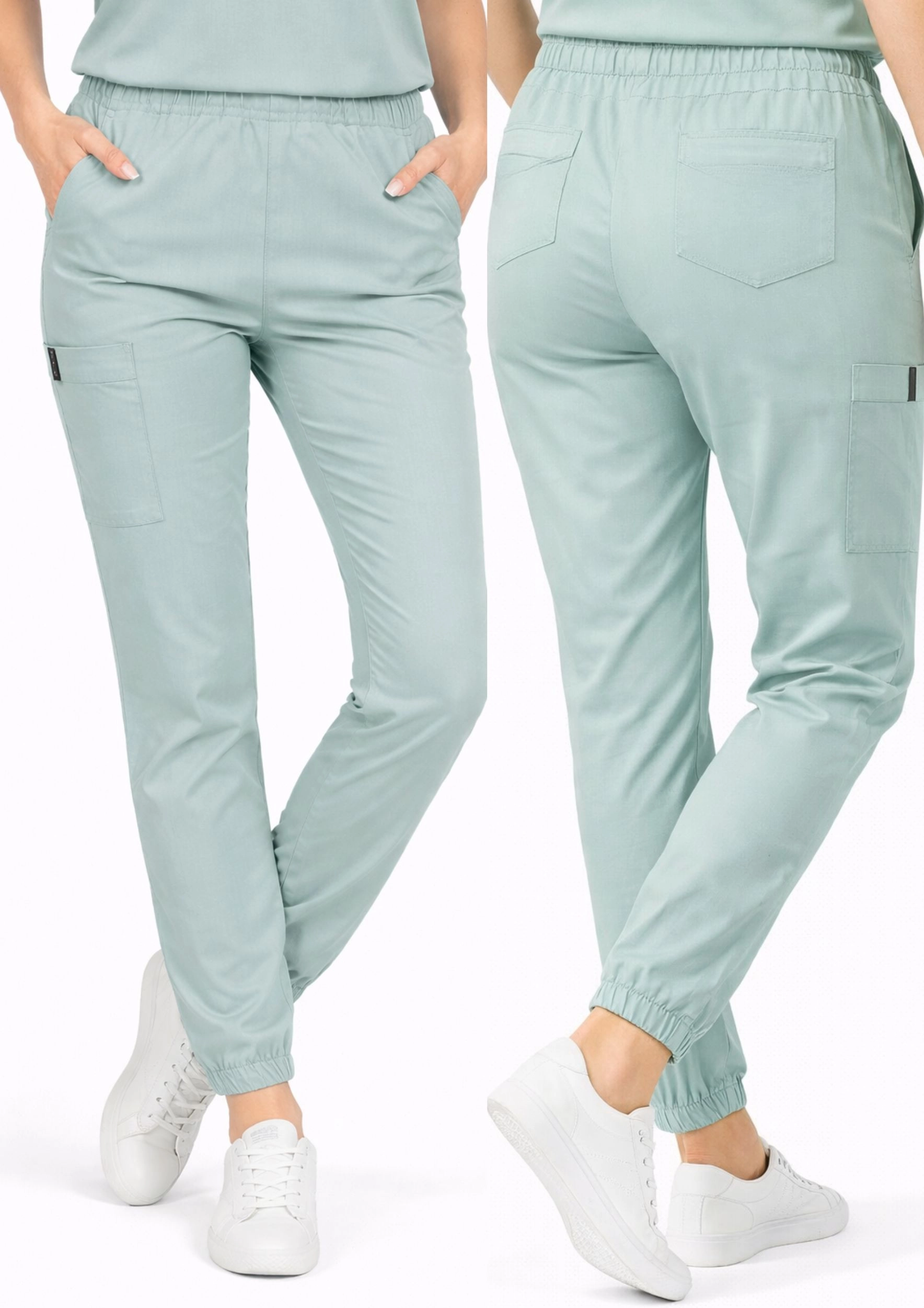 Spodnie medyczne typu jogger z wysokim stanem o sportowym kroj, wygodne i praktyczne. Pas na elastycznej szerokiej gumie, nogawki zakończone ściągaczem. Spodnie posiadają sześć kieszeni (2 z przodu,2 tylne i dwie boczne typu Cargo z miejscem na długopis).