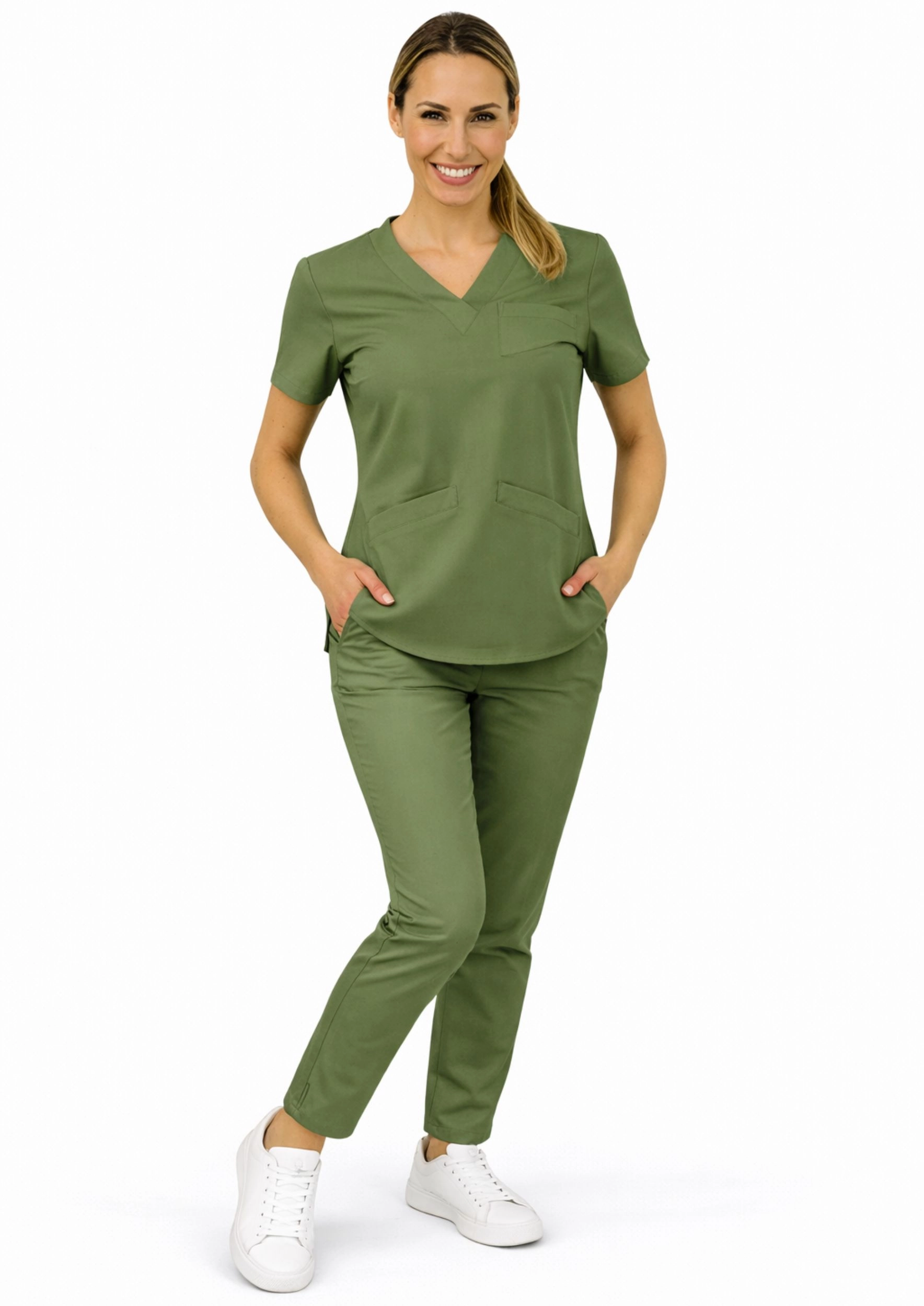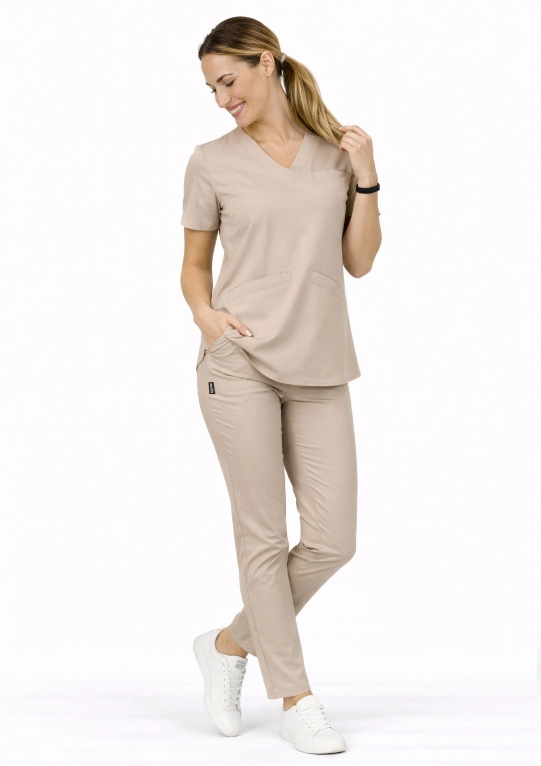 Komplet medyczny damski Beauty slim beż to propozycja dla osób, które chcą wyglądać profesjonalnie, ale bez sztywnego, typowo „szpitalnego” efektu. Beżowy kolor wprowadza do wizerunku elegancję i spokój, a jednocześnie dobrze wpisuje się w nowoczesne standardy odzieży medycznej. W połączeniu z elastyczną, mięsistą tkaniną daje realny komfort pracy, bez uczucia ograniczenia ruchów czy dyskomfortu przy długim noszeniu.