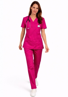 Komplet medyczny damski Comfort malina to profesjonalna odzież medyczna zaprojektowana z myślą o specjalistkach pracujących w środowisku klinicznym. Zestaw składa się z wygodnej bluzy oraz spodni o klasycznym, dopracowanym kroju, który zapewnia swobodę ruchów i estetyczny wygląd przez cały dzień pracy. Intensywny malinowy kolor sprawia, że komplet prezentuje się nowocześnie, a jednocześnie pozwala wyróżnić się w miejscu pracy.