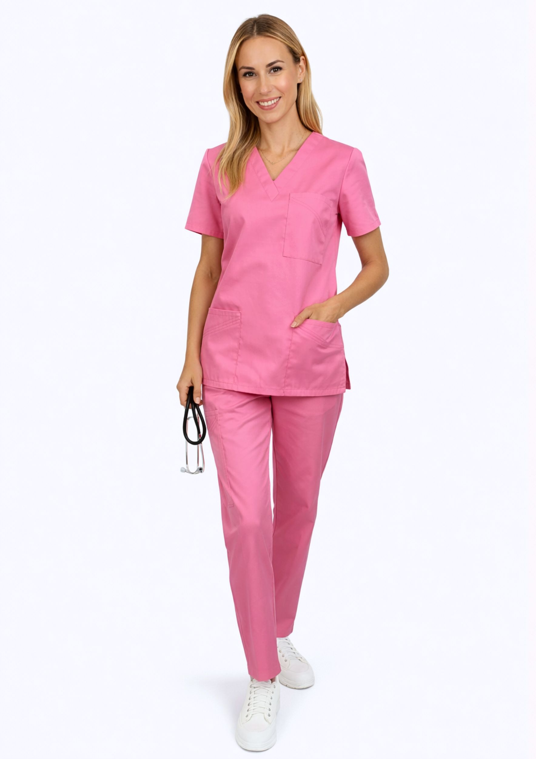 - Różowy kolor, który nadaje odzieży medycznej łagodniejszy i bardziej przyjazny wygląd.
