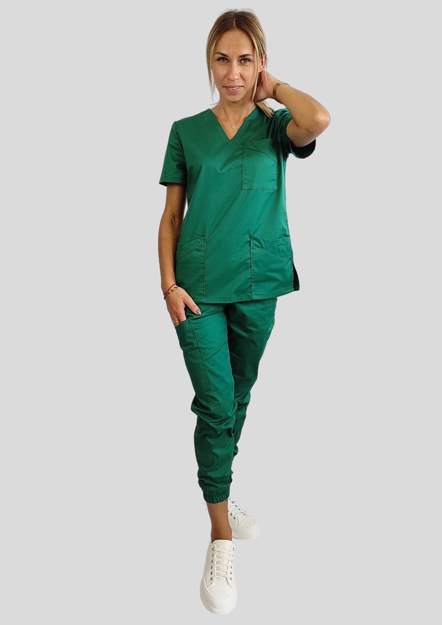 ✨Komplet medyczny damski Dynamic — elegancja, nowoczesny styl i komfort klasy premium! Komplet medyczny damski Dynamic to propozycja dla kobiet, które oczekują perfekcyjnego połączenia elegancji, funkcjonalności i najwyższej jakości wykonania ✨ Doskonale sprawdzi się jako profesjonalny strój medyczny dla lekarzy, pielęgniarek, stomatologów, fizjoterapeutów, kosmetologów czy weterynarzy ✨ Dlaczego warto wybrać komplet Dynamic? Bluza medyczna: ✅ Klasyczny dekolt w kształcie litery V ✅ Taliowany krój z pionowymi zaszewkami wysmuklającymi sylwetkę ✅ Aż 6 funkcjonalnych kieszeni: zewnętrzne i wewnętrzne, idealne na niezbędne akcesoria ✅ Zewnętrzne kieszenie ozdobione falistą linią, która dodaje bluzie unikalnego stylu ✅ Rozcięcia po bokach dla pełnej swobody ruchu ✅ Wzmocnione szwy w newralgicznych miejscach zapewniające trwałość ✅ Wykonana z elastycznej, oddychającej tkaniny przyjemnej dla skóry Spodnie medyczne typu jogger: ✅ Wysoki stan z elastycznym, szerokim pasem wzmacnianym przeszyciem ✅ Sportowy, nowoczesny krój z nogawkami zakończonymi ściągaczem ✅ 6 pojemnych kieszeni: boczne, tylne oraz cargo na udzie, z dodatkową wewnętrzną kieszenią wszytą wyżej dla atrakcyjnego wyglądu ✅ Lekka, przewiewna tkanina gwarantująca komfort noszenia przez cały dzień ✅ Wzmocnienia ryglami zwiększające wytrzymałość na codzienne użytkowanie Skład materiału: 53% bawełna, 44% poliester, 3% spandex Gramatura: 160 g/m² Dostępne rozmiary: od XXS do 3XL Produkt szyty w Polsce przez markę Euro-Styl — gwarancja wysokiej jakości i dbałości o detale! Dlaczego warto wybrać komplet Dynamic? ✅ Idealny wybór dla osób ceniących ekskluzywny, elegancki wygląd w pracy ✅ Zapewnia pełen komfort i swobodę ruchu przez długie godziny ✅ Odporny na spieranie i mechacenie — prezentuje się świetnie przez długi czas ✅ Dopasowany krój podkreśla sylwetkę i dodaje pewności siebie ✨ Polecamy do pracy w: ✅ Gabinetach lekarskich ✅ Klinicach stomatologicznych ✅ Gabinetach fizjoterapii ✅ Salonach kosmetycznych i medycyny estetycznej ✅ Przychodniach weterynaryjnych Zamów komplet medyczny damski Dynamic — inwestycja w Twój profesjonalny wizerunek i komfort każdego dnia!