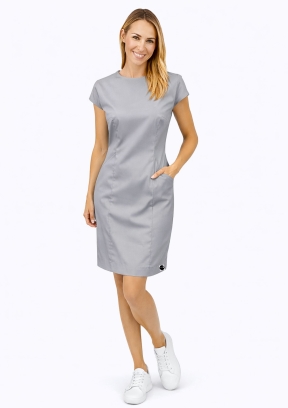 Sukienka medyczna zapinana na długi zamek kryty wszyty na plecach co ułatwia zakładanie sukienki. Rękaw krótki delikatnie opada na ramiona. Taliowany krój podkreśla sylwetkę, posiada dwa cięcia z przodu sukienki, w których mieszczą się skośne dwie pojemne kieszenie na niezbędne narzędzia, tył dwie zaszewki pionowe.