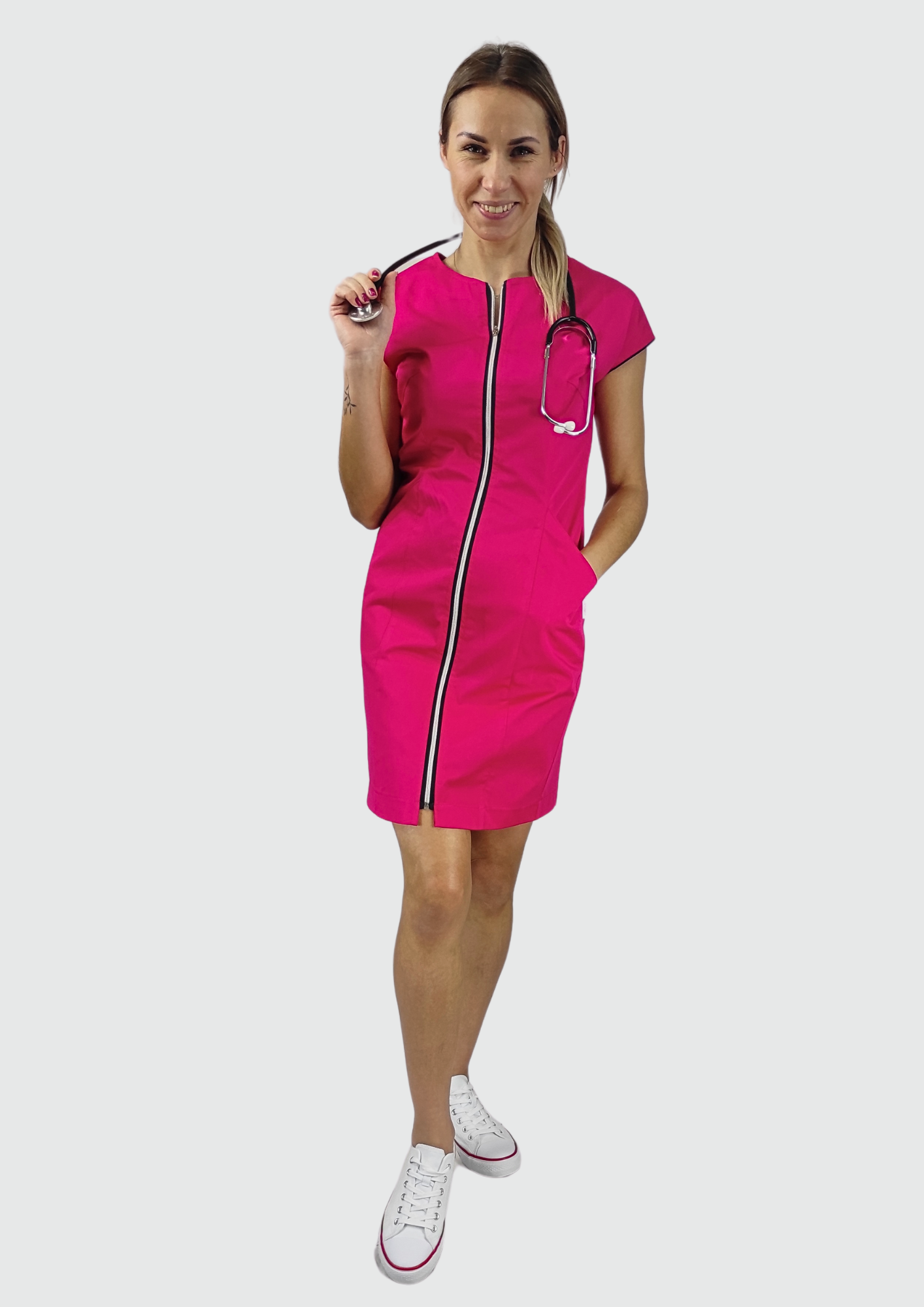 Idealna sukienka dla lekarzy, pielęgniarek, kosmetologów i fizjoterapeutek. Nasza sukienka medyczna damska łączy w sobie elegancję, profesjonalizm oraz wysoki komfort noszenia. Krótki rękaw, zapięcie na zamek w kolorze srebra i delikatne rozcięcie z tyłu nadają jej nowoczesnego stylu i funkcjonalności.