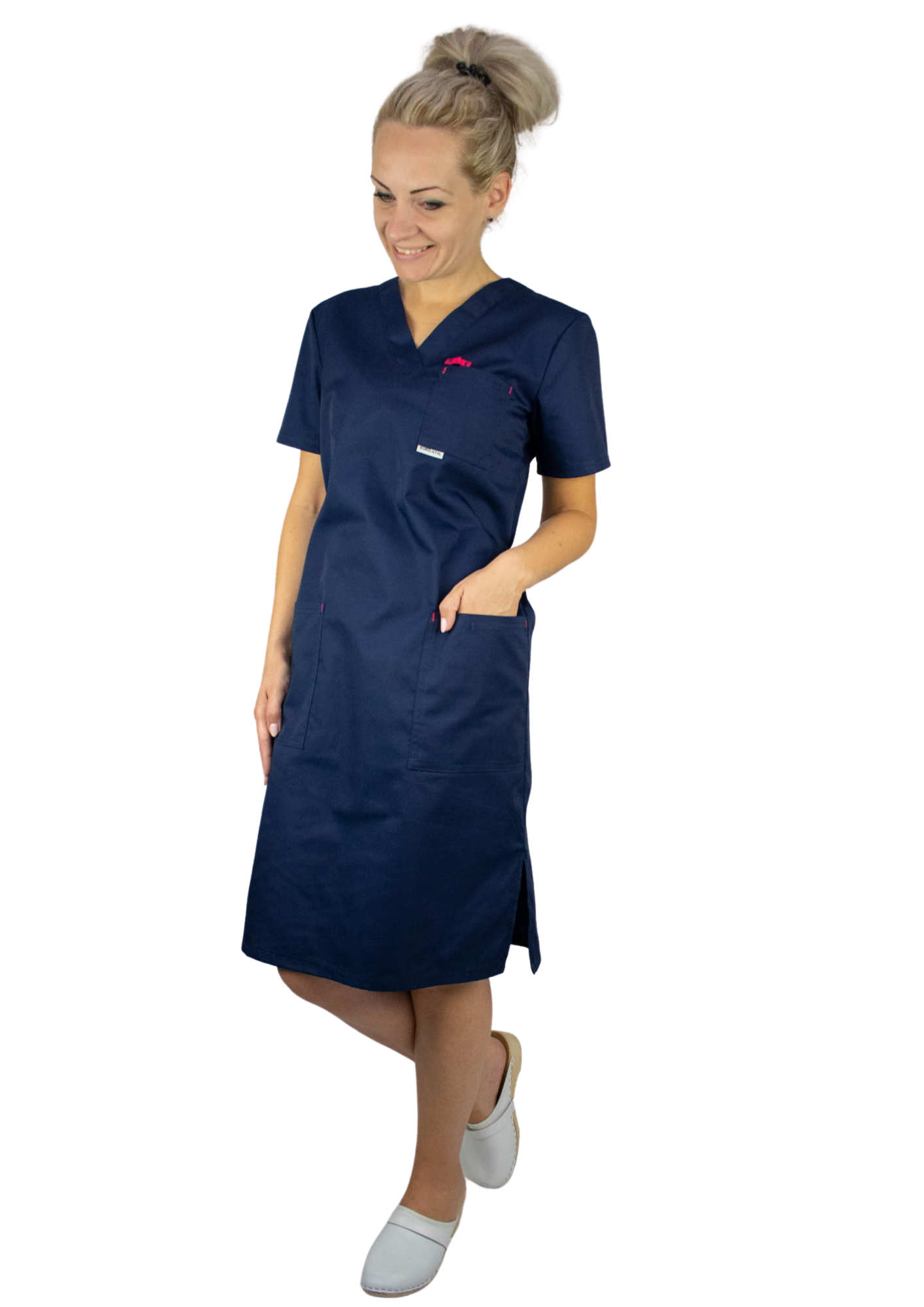 Sukienka medyczna to produkt skierowany do żeńskiej części personelu. Ma podnosić komfort pracy -tkanina nawet przez wiele godzin i przyjemna dla skóry. Dzięki pojemnym kieszeniom można zawsze mieć pod ręką niezbędne przybory i akcesoria. Sukienka posiada 3-kieszonki-przydatne podczas codziennych czynności - dwie na biodrach oraz jedną na piersi dodatkowo nad górną kieszonka uchwyt na długopis lub identyfikator. Wszystkie kieszenie wzmocnione ryglami co powoduje że są bardziej odporne na rozprucia podczas użytkowania