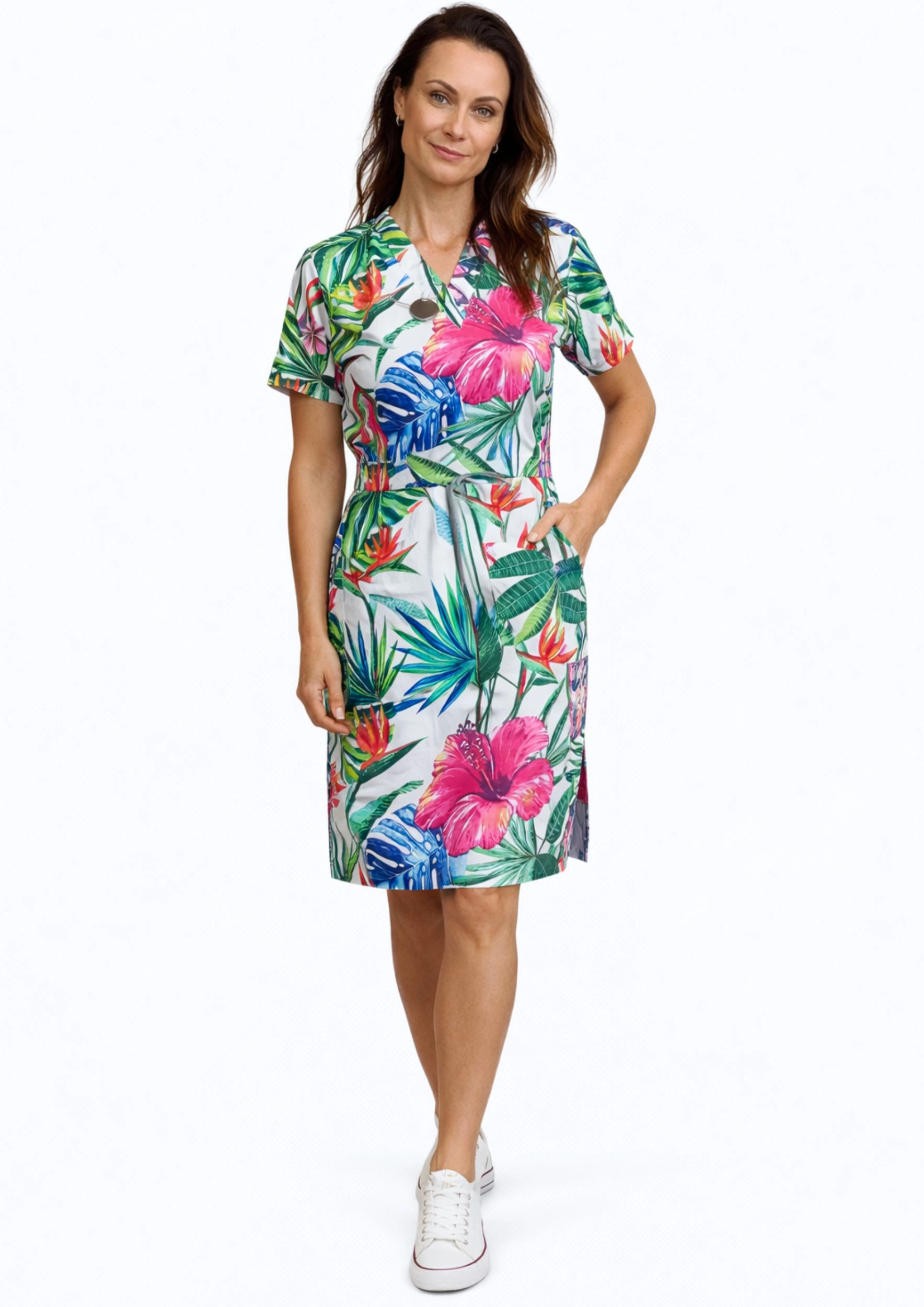 Sukienka posiada pojemne trzy kieszenie na niezbędne przybory i akcesoria. Dopasowany krój odzieży z lekkim taliowaniem prezentuje się niezwykle stylowo i klasycznie. W pasie wszyte troczki dla lepszego dopasowania i podkreślenia tali. Dekolt w kształcie litery V. Boczne rozcięcia u dołu zwiększają zakres ruchów.