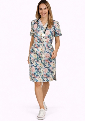 Sukienka posiada 3 praktyczne kieszenie – dwie na biodrach i jedną na piersi, co czyni ją idealnym wyborem do pracy lub codziennych aktywności. Dekolt w serek i taliowany krój podkreślają sylwetkę, a dwa boczne rozcięcia dodają swobody ruchów.