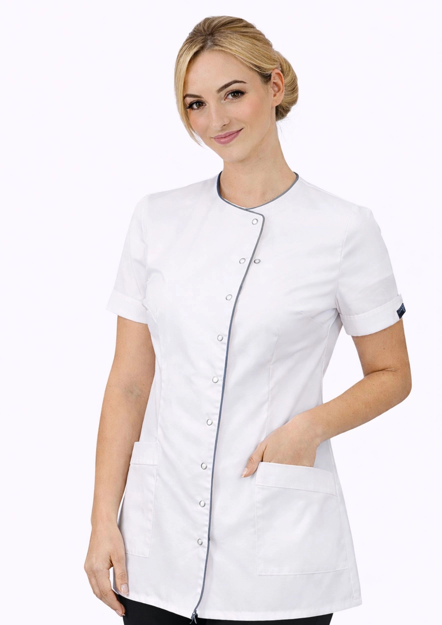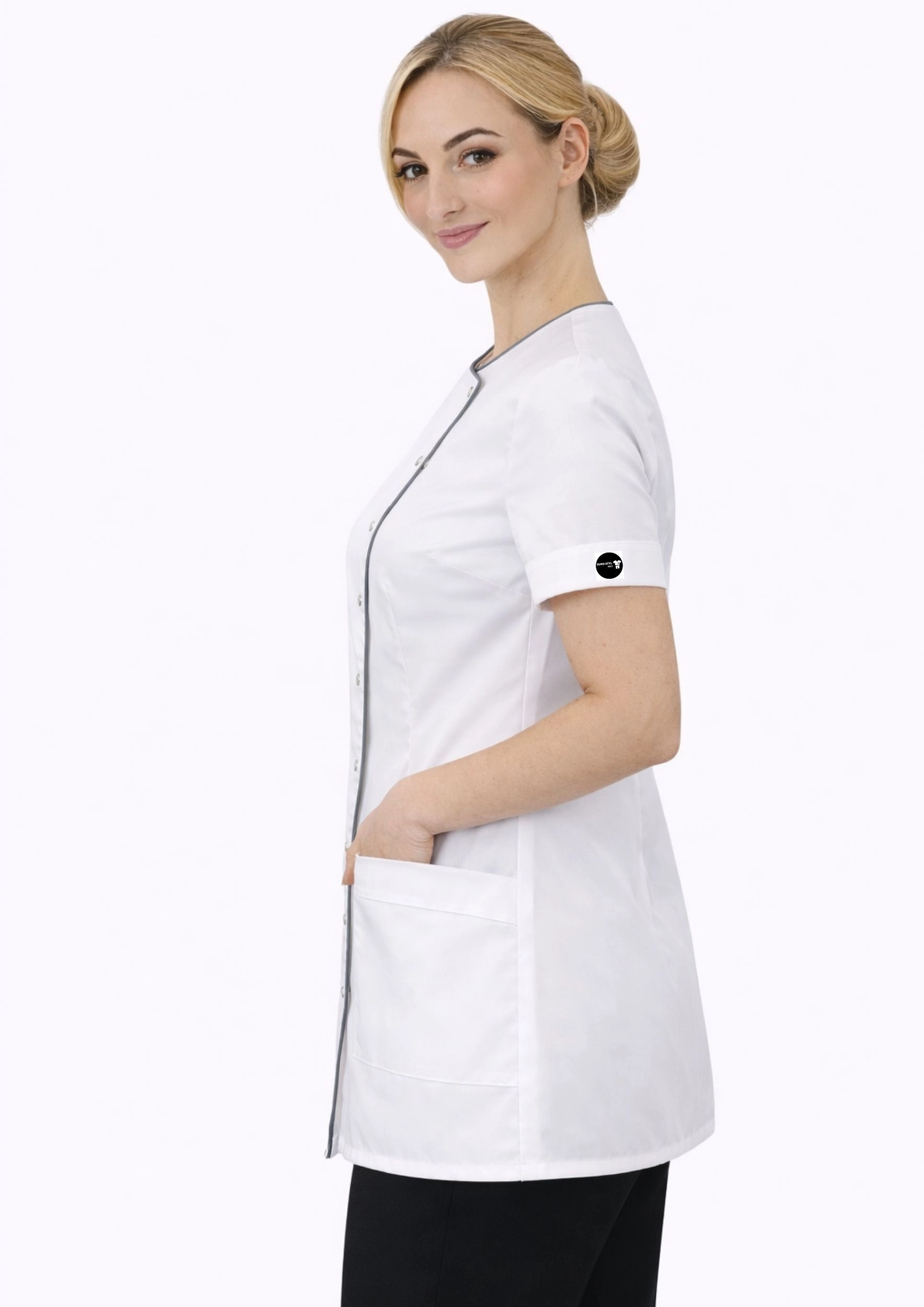Elegancka i funkcjonalna tunika medyczna damska, zaprojektowana z myślą o codziennej pracy w gabinecie. Idealne połączenie estetyki, wygody oraz trwałości, które podkreśla profesjonalny wizerunek personelu.