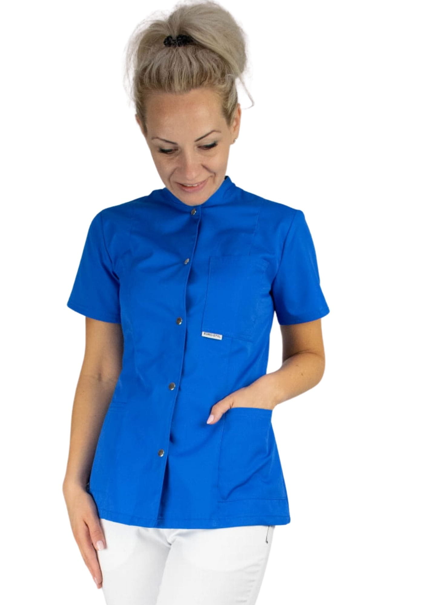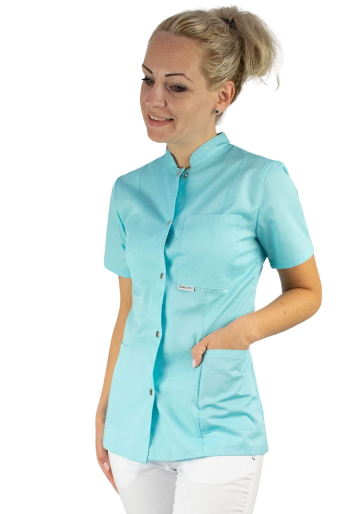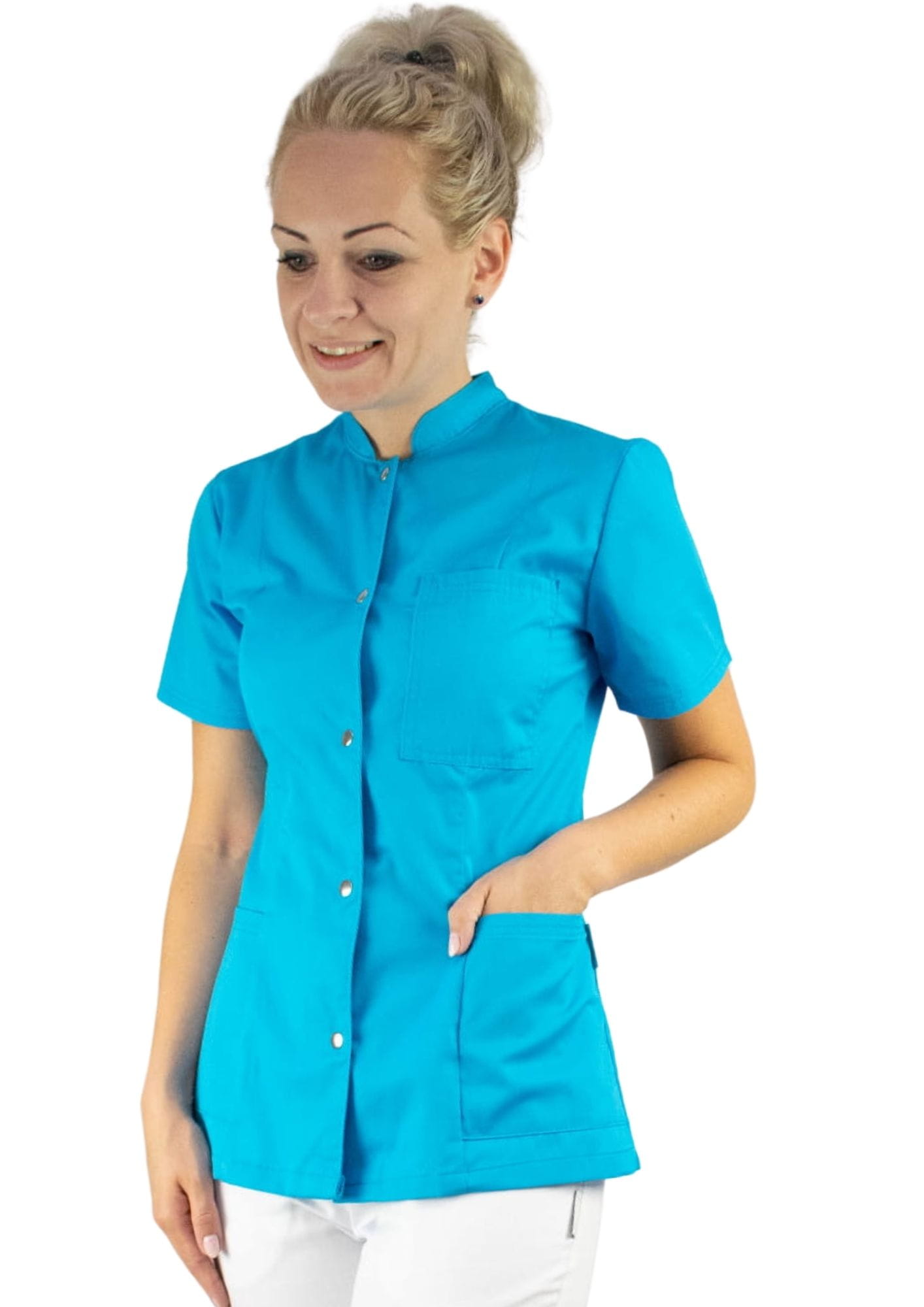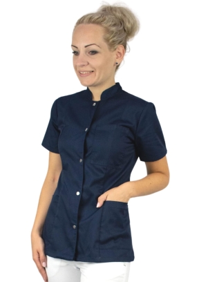 Bardzo wygodny żakiet medyczny wykończony stójką. Taliowany.