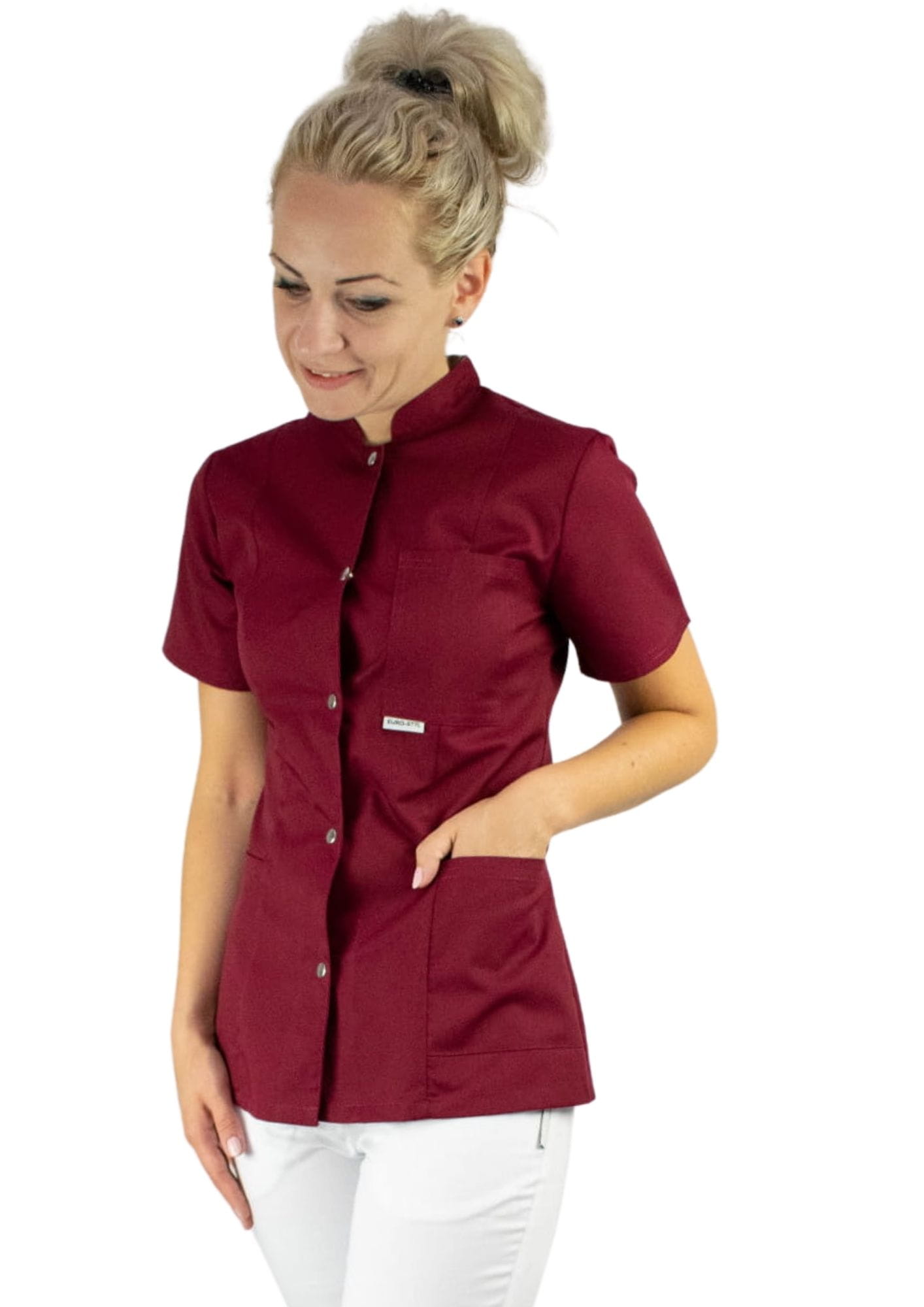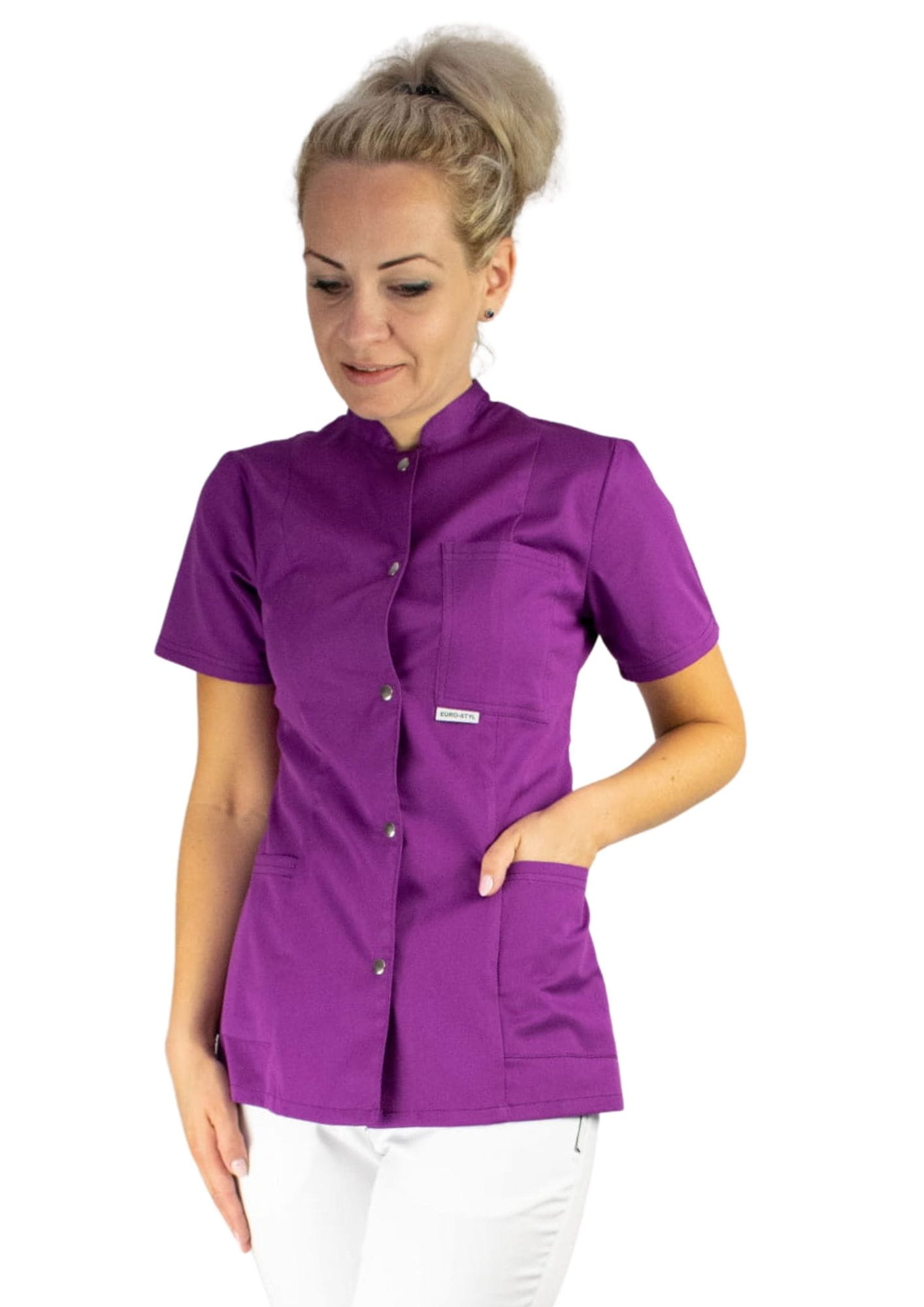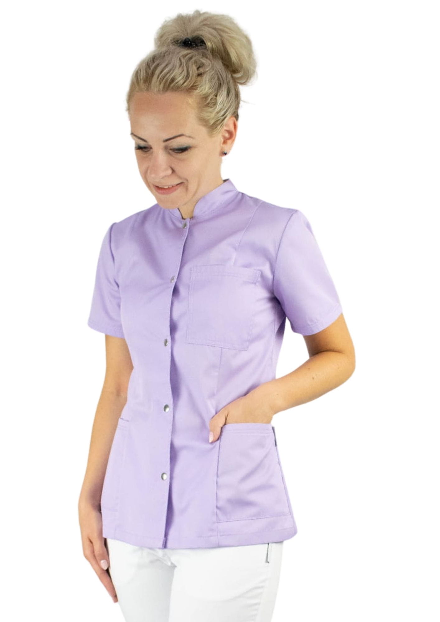 Bardzo wygodny żakiet medyczny wykończony stójką. Taliowany.