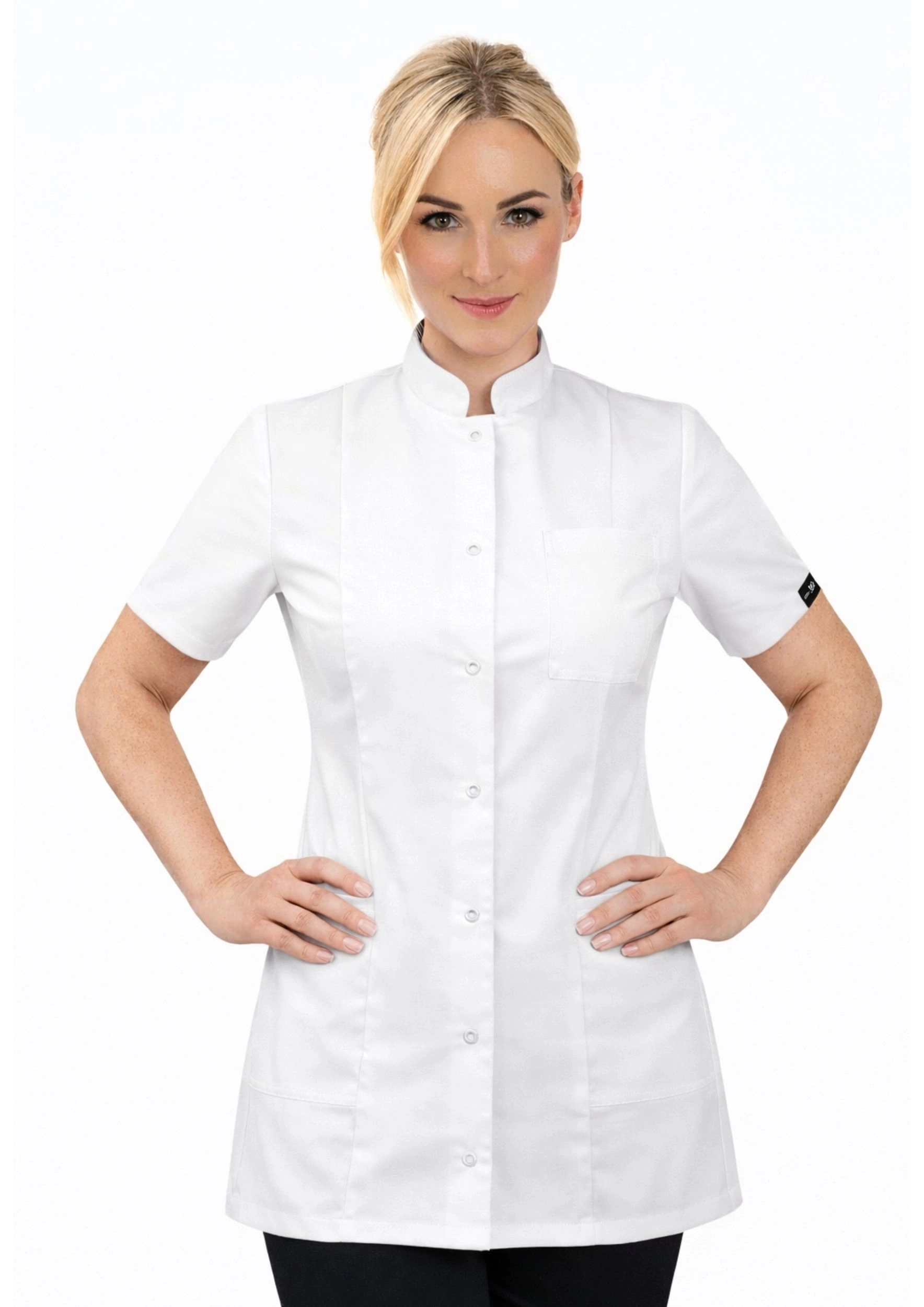 - Dłuższy rękaw – zapewnia wygodę i profesjonalny wygląd, idealny do pracy w gabinetach medycznych i kosmetycznych.