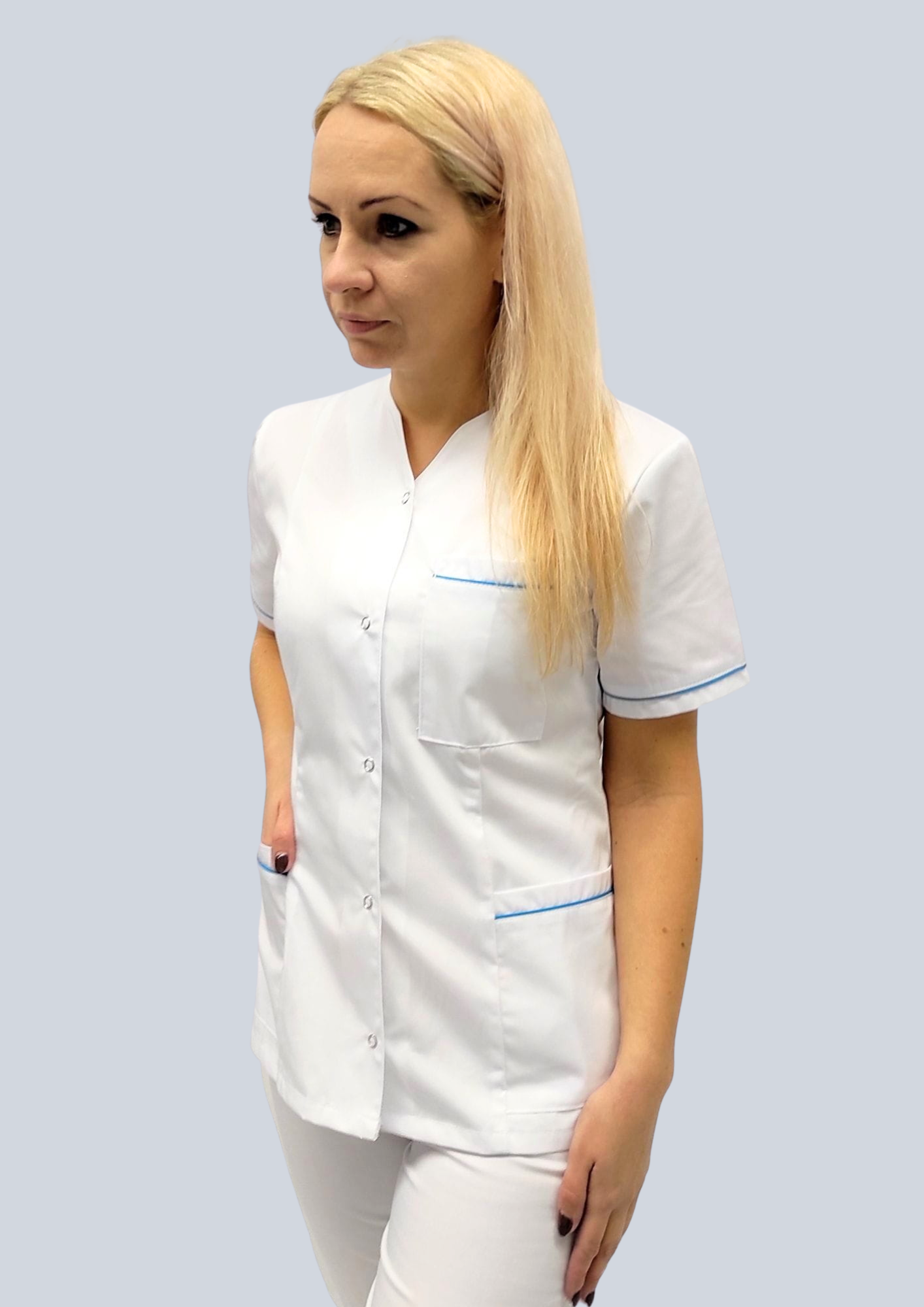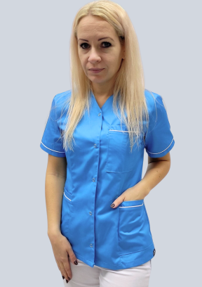 Żakiet medyczny damski został zaprojektowany z myślą o kobietach, które cenią komfort, profesjonalny wygląd i wyjątkowy design. Oryginalny dekolt w połączeniu z kontrastową wypustką w kolorze turkusowym lub oberżynowym sprawia, że model wyróżnia się na tle klasycznej odzieży medycznej.